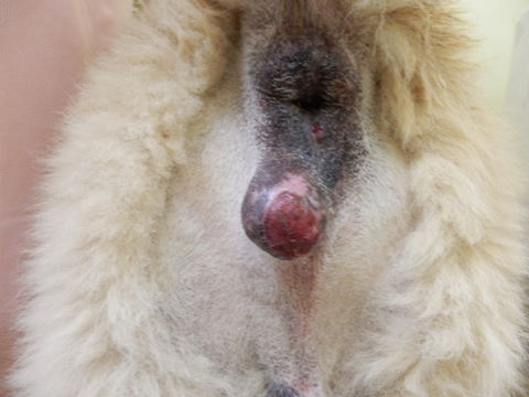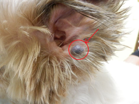 犬の体じゅうにいぼができている